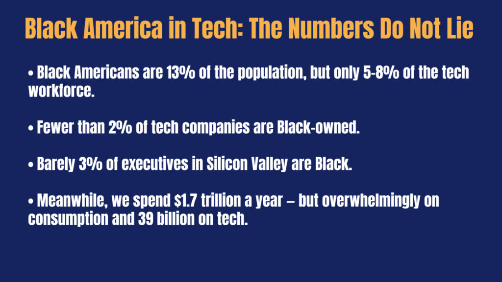 Black Americans are thirteen percent of the U.S. population but only five to eight percent of the tech workforce. Less than two percent of tech companies are Black-owned. Only three percent of executives in Silicon Valley are Black. Yet, we spend $ 1.7 trillion annually as consumers, including $39 billion on tech products, with little to no ownership in emerging technologies.