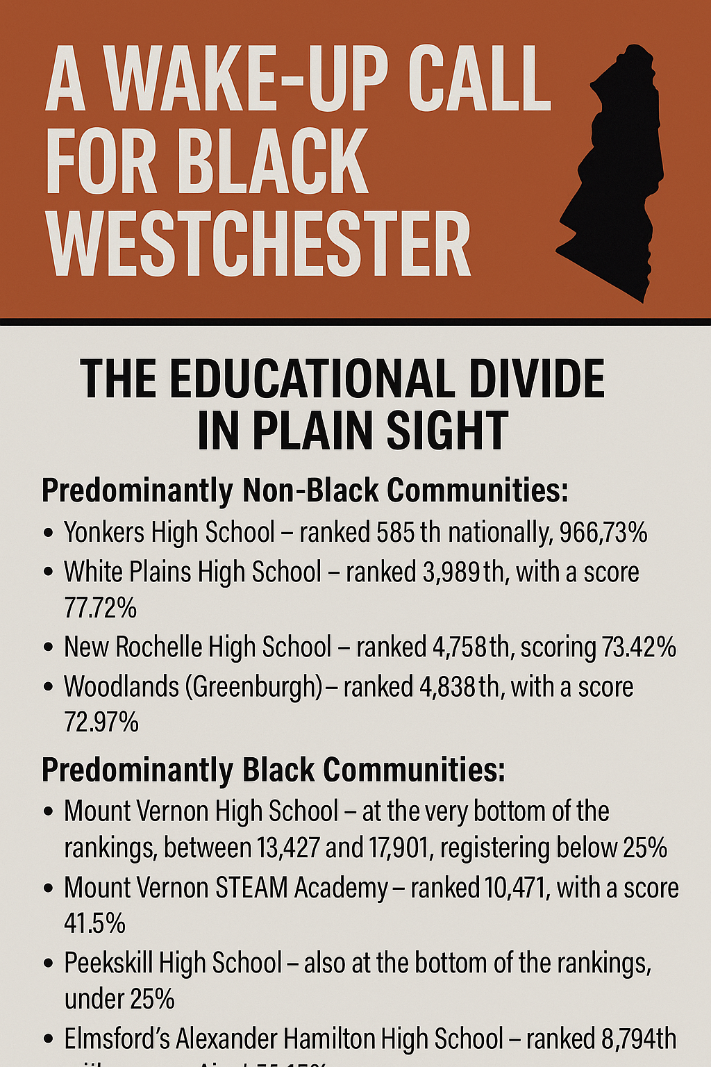 If you asked a teenager at Yonkers High School where their school ranks, you’d hear pride: 585th nationally, scoring 96.73%. Just a few miles south in Mount Vernon, the story is shameful. Mount Vernon High School ranks between 13,427 and 17,901 nationally, with less than a 25% score. Mount Vernon STEAM Academy is ranked 10,471, at just 41.5%. These aren’t just numbers. They are the visible proof of educational apartheid in Westchester County. While some schools thrive, Black-majority districts like Mount Vernon and Peekskill languish at the bottom. For Black parents and residents across this county, this must be a wake-up call. Our children are not getting the education they deserve, and if we don’t demand change, we are complicit in their failure.