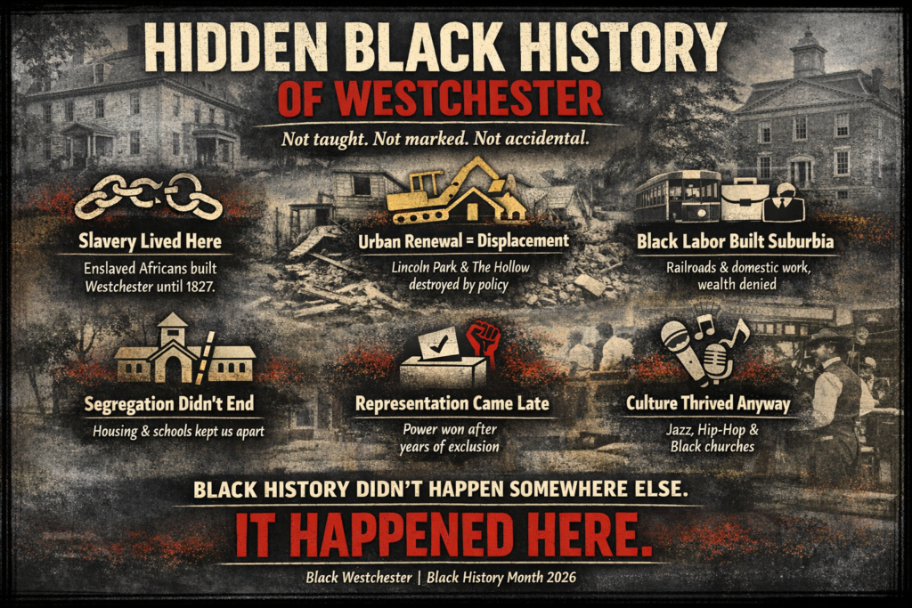 So why does this matter in 2026 – Black History Month isn’t just about celebration—it’s about truth-telling. In 2026, Black History Month cannot remain a comfort ritual. In Westchester, it must become a reckoning. What does that mean or look like? That means marking lost communities, not only celebrating leaders, naming enslavement, not just abolition, acknowledging displacement, not just diversity, and teaching policy harm, not just personal success. If the county wants an honest Black History Month, it must honor communities lost, not just leaders crowned.