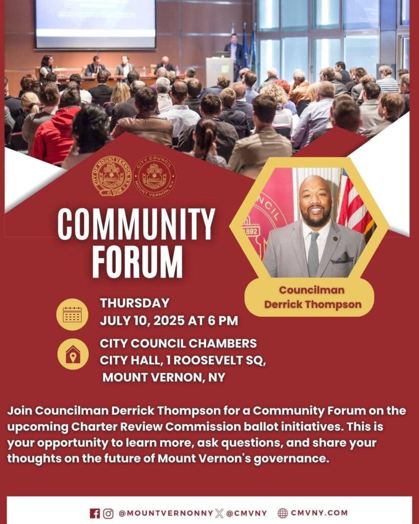 Councilman Derrick Thompson is hosting a public forum on the Charter Review Commission ballot initiatives on Thursday, July 10, 2025, at 6:00 PM in the City Council Chambers. Why is this important, simple? This is potentially a seismic shift in the structure of the city of Mount Vernon’s government. The Charter Review Commission would like Mount Vernon to have a City Manager and an appointed Comptroller, which can change how our city truly operates / functions.