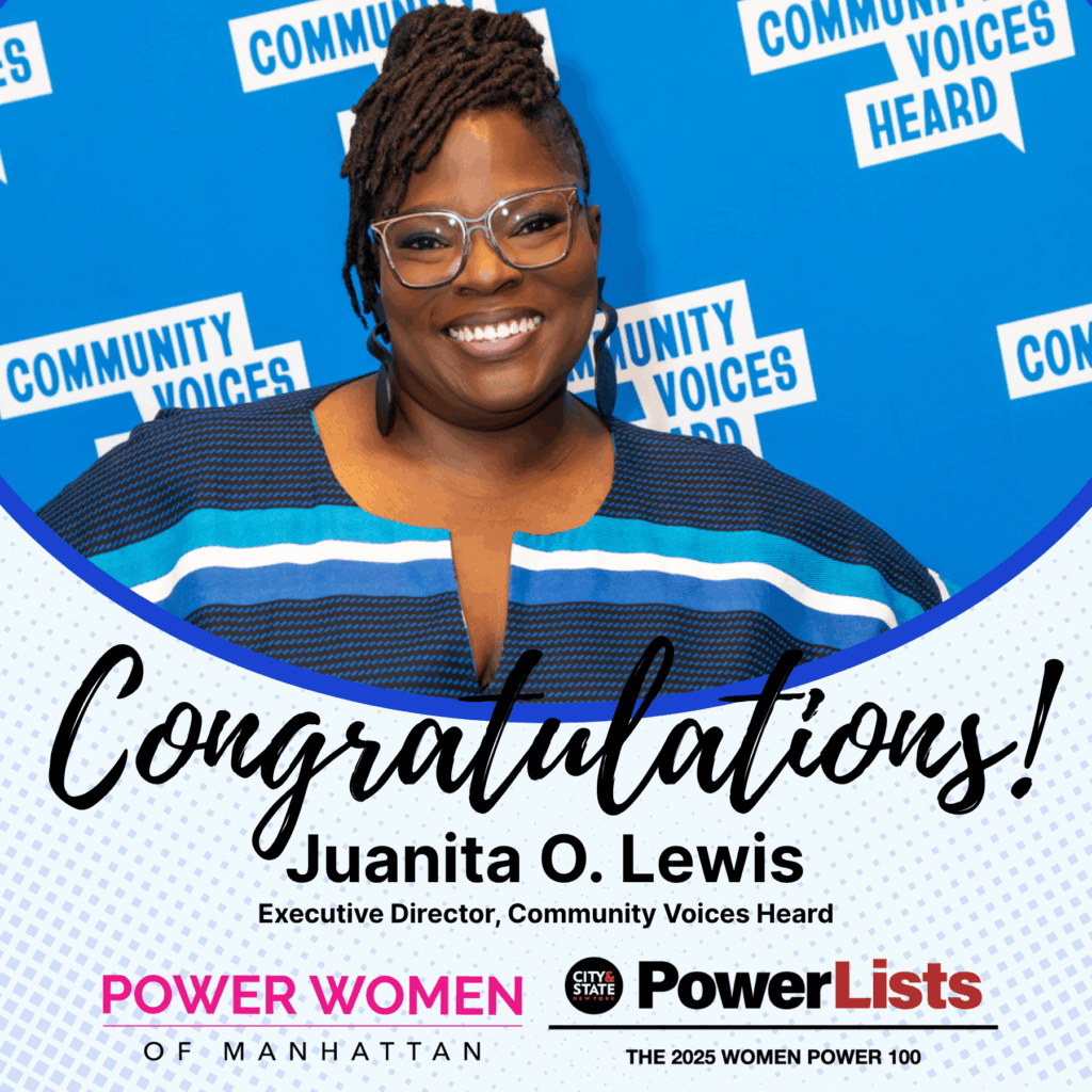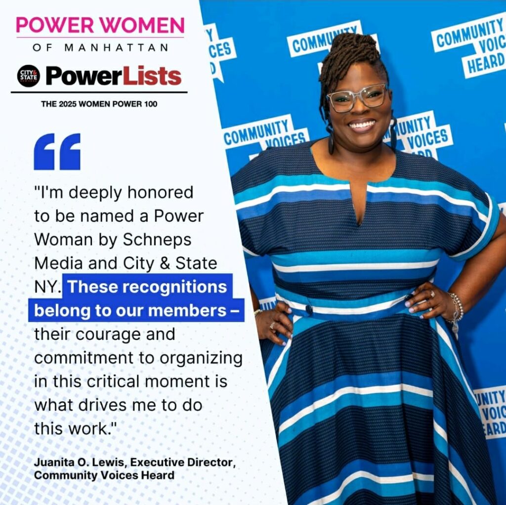 Congratulations to Community Voices Heard’s Executive Director, Juanita O. Lewis, who has been named to both Schneps Media’s Power Women of Manhattan and City & State’s 2025 Women Power 100.