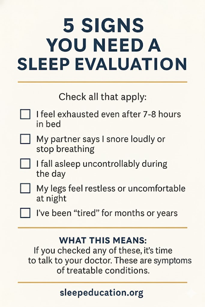 Ask yourself: Do I feel exhausted even after 7–8 hours in bed? Does my partner mention snoring or pauses in breathing? Do I fall asleep unintentionally during the day? Do my legs feel restless at night? Have I been tired for months or years?