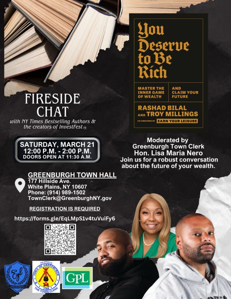 On Saturday, March 21, 2026, I showed up to Greenburgh Town Hall for a Fireside Chat called “You Deserve to Be Rich,” and I already knew I was not sitting in the back like this was something to casually observe.
