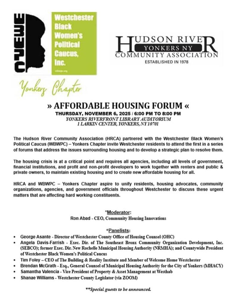 The Hudson River Community Association (HRCA), established in 1978, has partnered with the Westchester Black Women’s Political Caucus (WBWPC) – Yonkers Chapter to present this series of forums on critical housing issues in Westchester County.