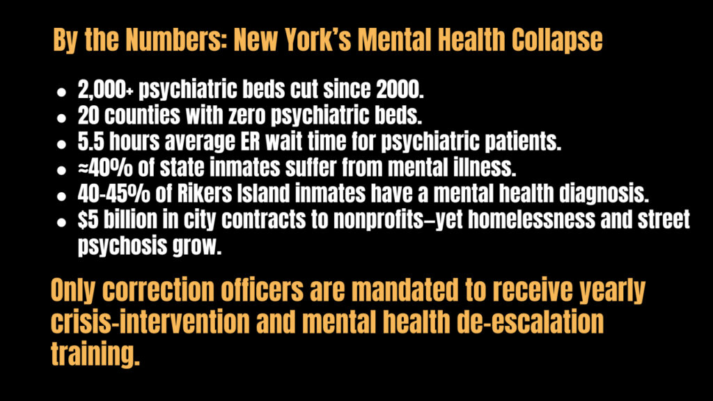 For decades, New York politicians congratulated themselves for closing psychiatric hospitals and cutting inpatient beds. They called it progress. In reality, it was abandonment. Since 2000, more than two thousand psychiatric beds have been eliminated across the state. During COVID, New York City shut down nearly a fifth of its psychiatric beds and never brought them back. Entire counties—twenty in all, covering almost a million residents—now have no psychiatric beds at all. Families in crisis sit in emergency rooms for hours, hoping for care that often doesn’t exist.