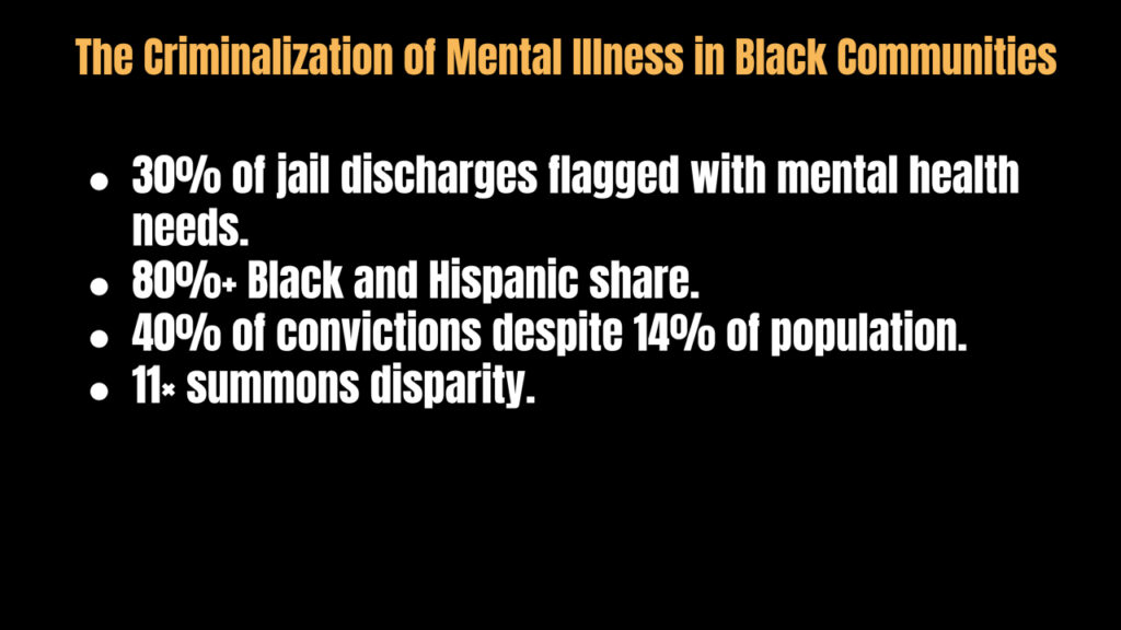 These are not abstract disparities. They show how untreated mental illness and broken policies combine to criminalize entire communities. In Black neighborhoods, the lack of hospital beds and preventive care means more encounters with police, more arrests for survival-based crimes, and more families torn apart. Mental illness that should be treated in hospitals is punished in courtrooms. And the cycle continues.