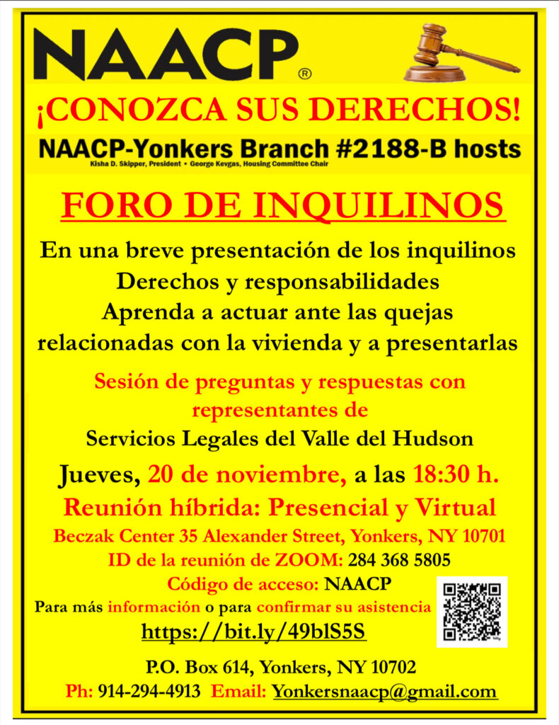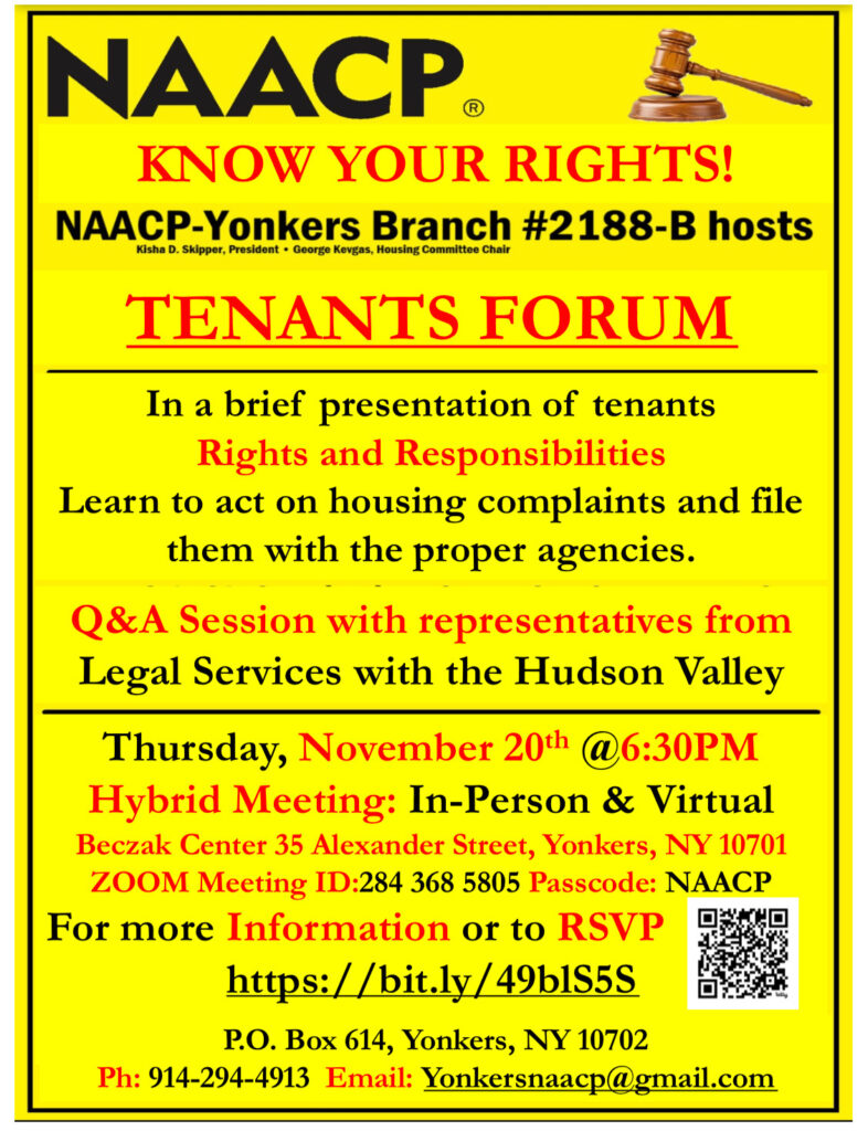 NAACP-Yonkers Branch Housing Committee will be hosting a Know Your Rights Tenant Forum on Thursday, November 20, 2025, at Sarah Lawrence College Center for the Urban River at Beczak located at 35 Alexander Street in Yonkers.