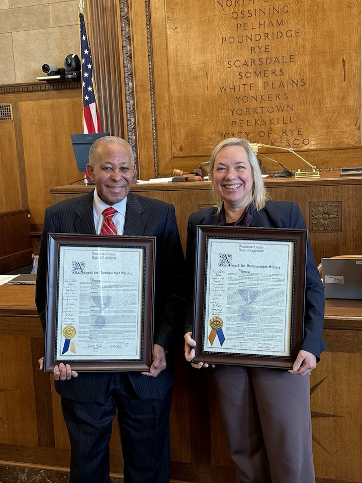 On Monday, December 8th, the Board of Legislators honored Legislator Ben Boykin, District 5 (representing most of White Plains, all of Scarsdale, and West Harrison), and Legislator Catherine F. Parker, District 7 (representing Larchmont, Mamaroneck, Rye, and part of Harrison), with the Westchester County Distinguished Service Award, the highest level of recognition the Board can bestow.