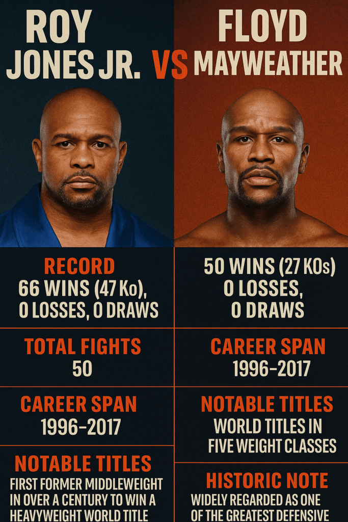 For Roy Jones Jr., this fight is about validation—proving that greatness is more than an undefeated record. For Floyd Mayweather, it’s about protecting a legacy built on perfection. If the two ever step into the ring for real, it won’t just be a fight; it will be a clash of philosophies: calculated mastery versus fearless risk-taking, the businessman versus the warrior.