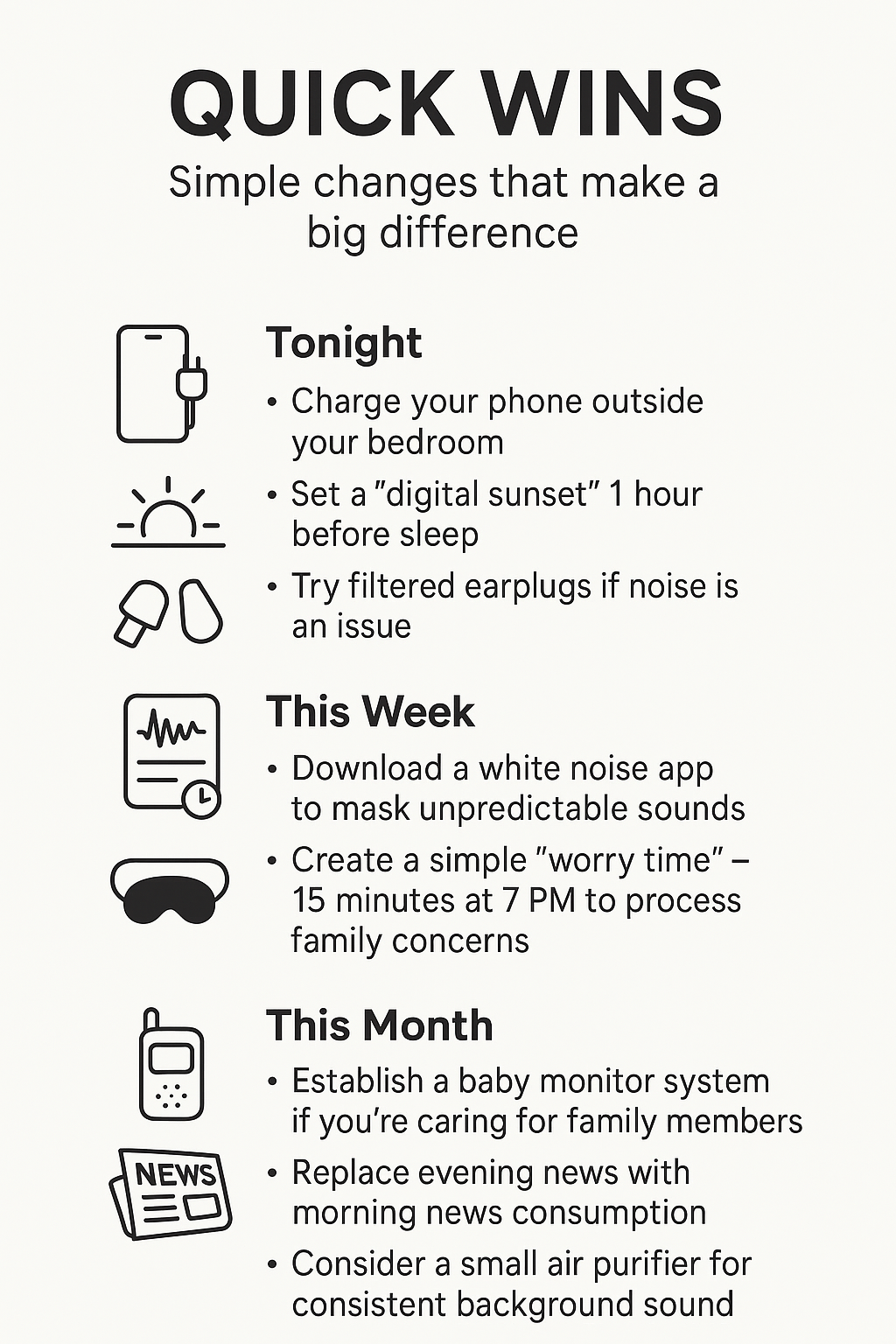 For Chronic Vigilance: Set up technology solutions for legitimate monitoring needs – baby monitors, medical alert systems. Create a designated “worry time” to process family concerns outside of sleep hours. Try progressive muscle relaxation to signal safety to your nervous system.