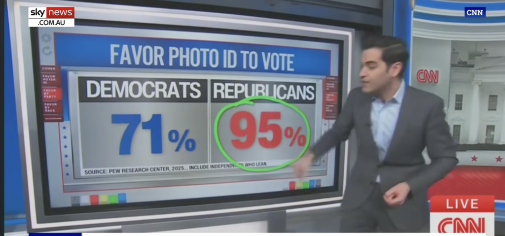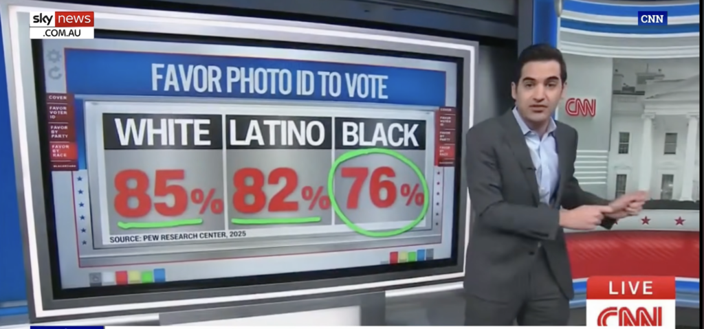 For years, the debate has been framed as a moral struggle — security versus suppression, access versus discrimination. But polling has quietly exposed something far less dramatic and far more politically consequential: overwhelming agreement. According to CNN’s own polling analysis, roughly 83% of Americans favor photo ID for voting — including 95% of Republicans, 71% of Democrats, 85% of White voters, 82% of Hispanic voters, and 76% of Black voters.