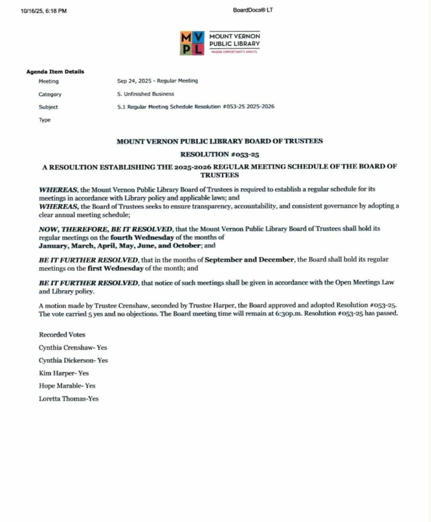 What in the world is going on at the Mount Vernon Public Library? At the September 24th meeting, the board passed Resolution #053-25, which changed the board’s regular meeting schedule. Instead of meeting on the third Wednesday of every month (except for August), which had been the schedule for decades, the board reduced the number of its regular meetings from eleven to eight. Going forward, the January, March, April, May, June, and October regular meetings will be held on the fourth Wednesday of the month, with the September and December regular meetings taking place on the first Wednesday of the month. February, July, and November meetings were eliminated in addition to August.
