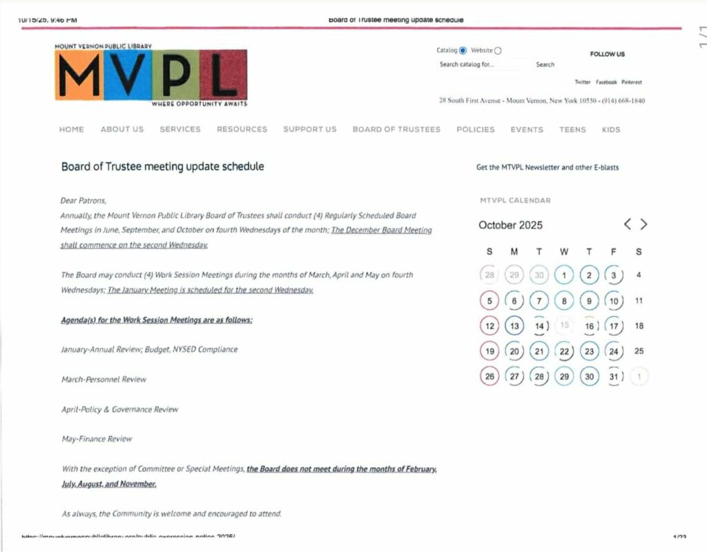 On September 22nd, the library’s board voted to suspend public expression until further notice.  Now they’re making their meeting schedule so confusing that the public won’t even know when to go and silently watch the proceedings. If you believe that this board’s decisions are hurting our library, please attend the Mount Vernon Public Library’s regular board meeting on Wednesday, October 22nd, at 6:30 pm in the Community Room. Come out and tell this board to rescind Resolutions #053-25 and #058-25, which suspended public expression. It’s our library, and it is our responsibility to hold the people in charge of it accountable for its care.