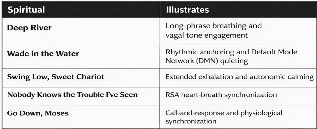 You can read about RSA and vagal tone all day, but put on “Deep River,” and the body will show you what the science means. Here are five foundational Negro Spirituals that illustrate different aspects of these principles. Each one activates the body differently, and while precise neuroscience labels cannot be assigned to individual songs with certainty, each one engages the systems described above. These songs illustrate principles, not prescriptions; their power lives in communal context, not isolated consumption: