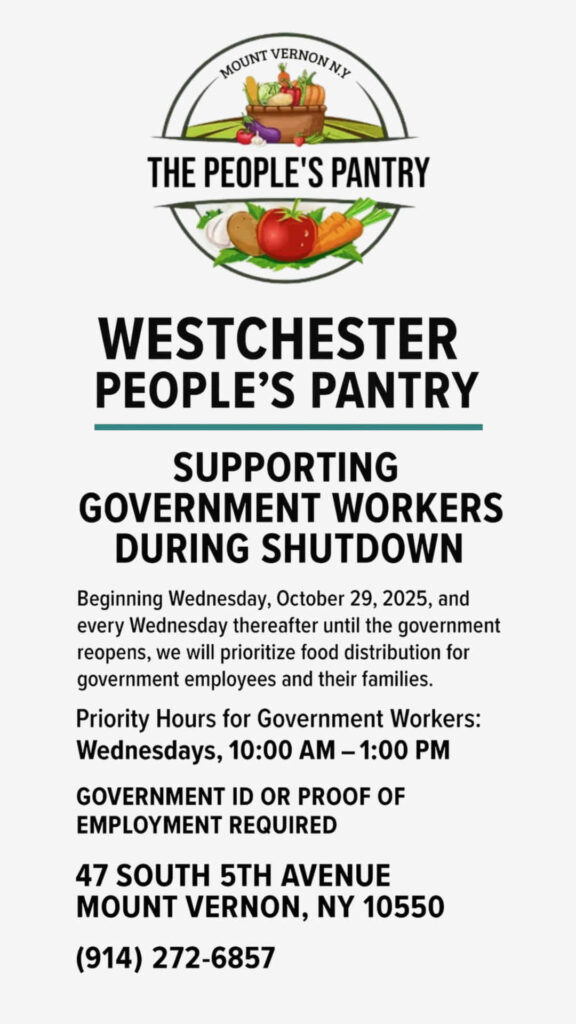 The Westchester People’s Pantry is located at 47 South 5th Avenue in Mount Vernon. The Priority Hours for Government Workers are Wednesdays, 10:00 a.m. — 1:00 p.m., starting October 29, 2025, and continuing weekly until the government reopens