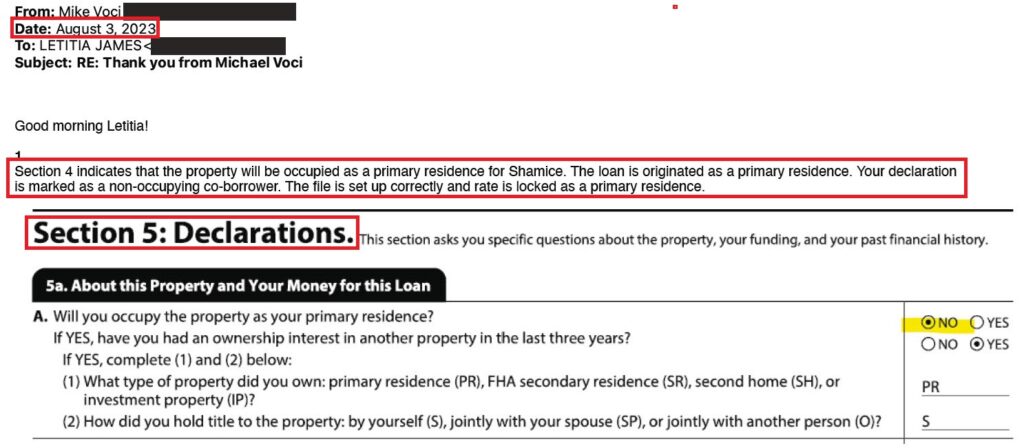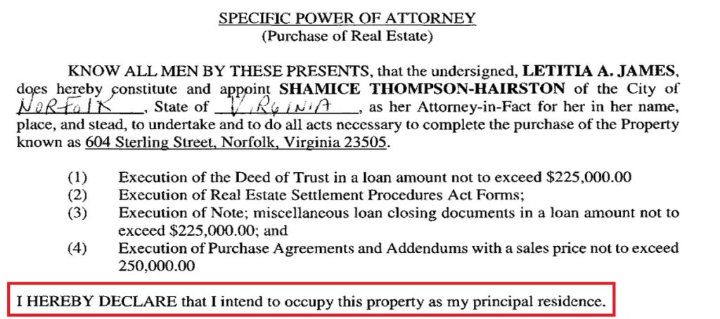 Her attorney, Abby Lel, reportedly told federal investigators that James never intended to occupy the Virginia property, contradicting her signed affidavit to the lender. If true, either the mortgage application was fraudulent or her state disclosures were — but both cannot be true.
