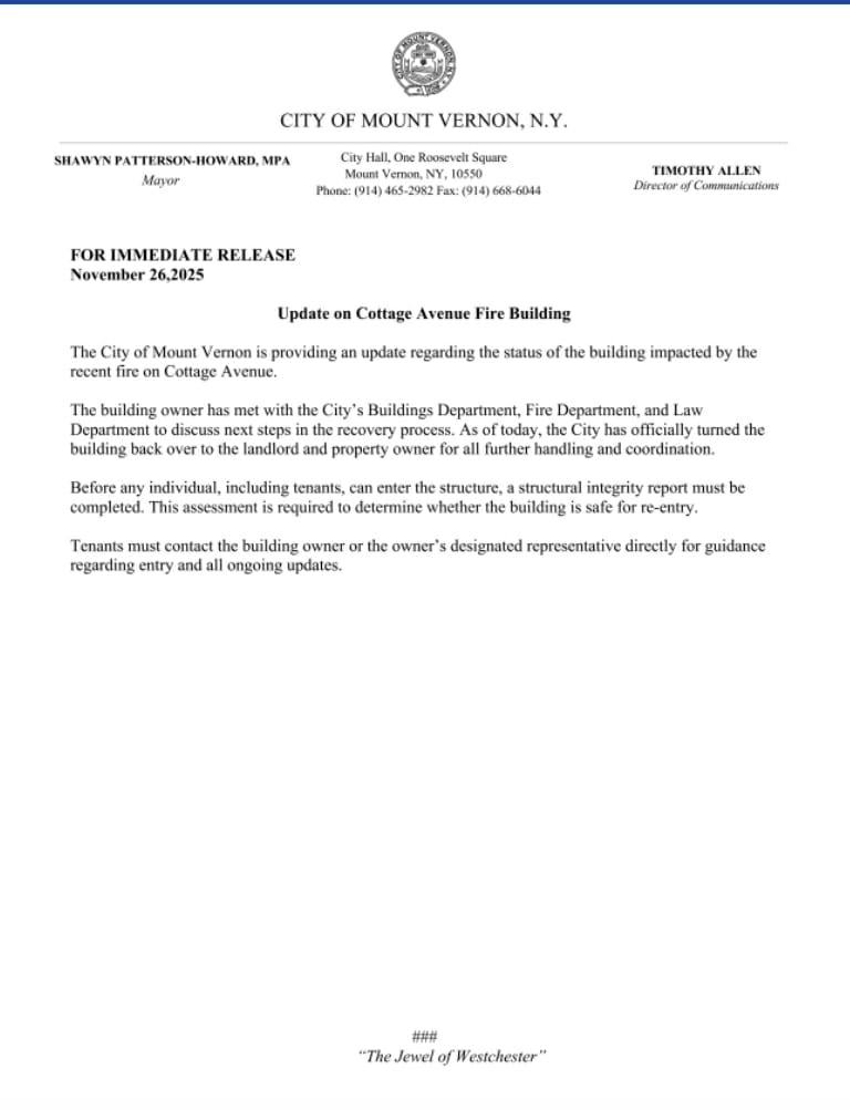 Hundreds of people have lost nearly everything in a devastating fire that ravaged an apartment building at 30 Cottage Avenue in Mount Vernon on Sunday, November 23rd. The City of Mount Vernon has been provided an update regarding the status of the building on Wednesday.